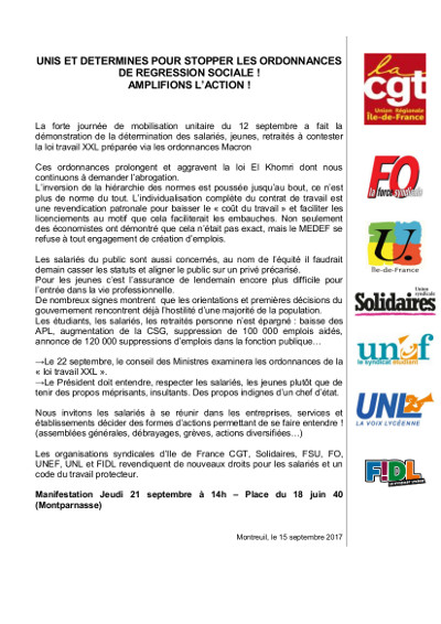 21 Septembre : UNIS et DETERMINES pour stopper les ordonnances