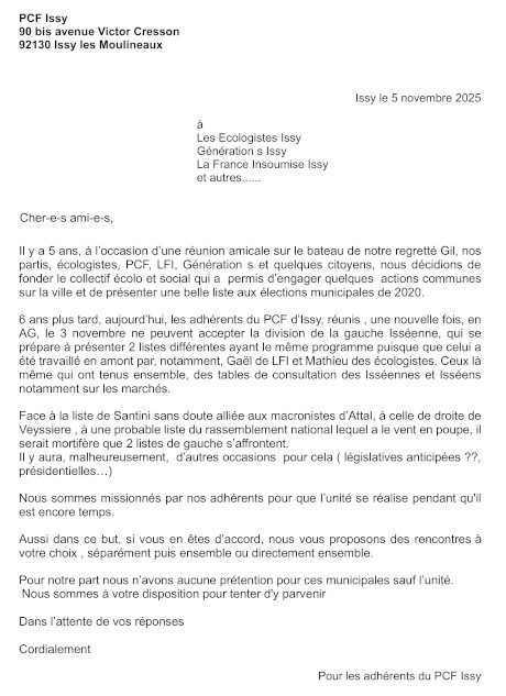 le courrier que le PCF d'Issy a fait parvenir aux différents